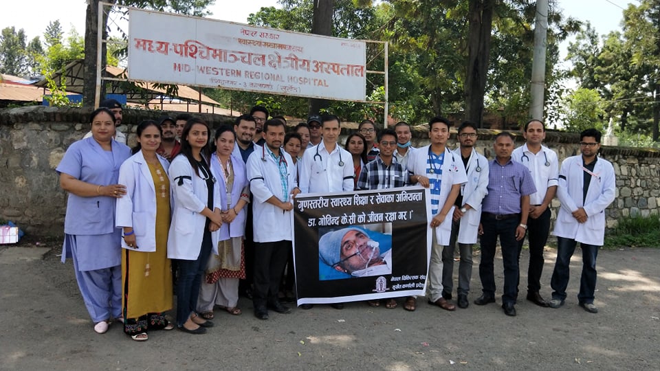 नेपाल चिकित्सक संघ सुर्खेत शाखाले प्रा. डा. गोविन्द केसीको आमरण अनसनको आन्दोलनमा नेपाल चिकित्सक संघ सुर्खेत शाखाले समेत ऐक्यवद्धता जनाएको छ । दुई दिनदेखि कालो पट्टी बाँधेर काम गरिरहेका चिकित्सकहरुले बिहीबार एक प्रेस विज्ञप्ति जारी गरी चिकित्सक संघले ऐक्यवद्धता जनाएको हो । ‘विगत ६ दिनदेखि गुणस्तरी स्वास्थ्य शिक्षा र सेवाको माग राखी जुम्लामा अनसन बस्नु भएका प्रा. डा. केसीको स्वास्थ्यमा प्रतिकूल असरहरु देखा पर्दै गएको र कुनै पनि समयमा अप्रिय घटना घट्न सक्ने तर्फ सचेत रहँदै नेपाल सरकारलाई अविलम्ब समस्याको समाधान गर्न र डा. केसीको जीवन रक्षा गर्न संघ जोडदार माग गर्दछ’ विज्ञप्तिमा भनिएको छ ।