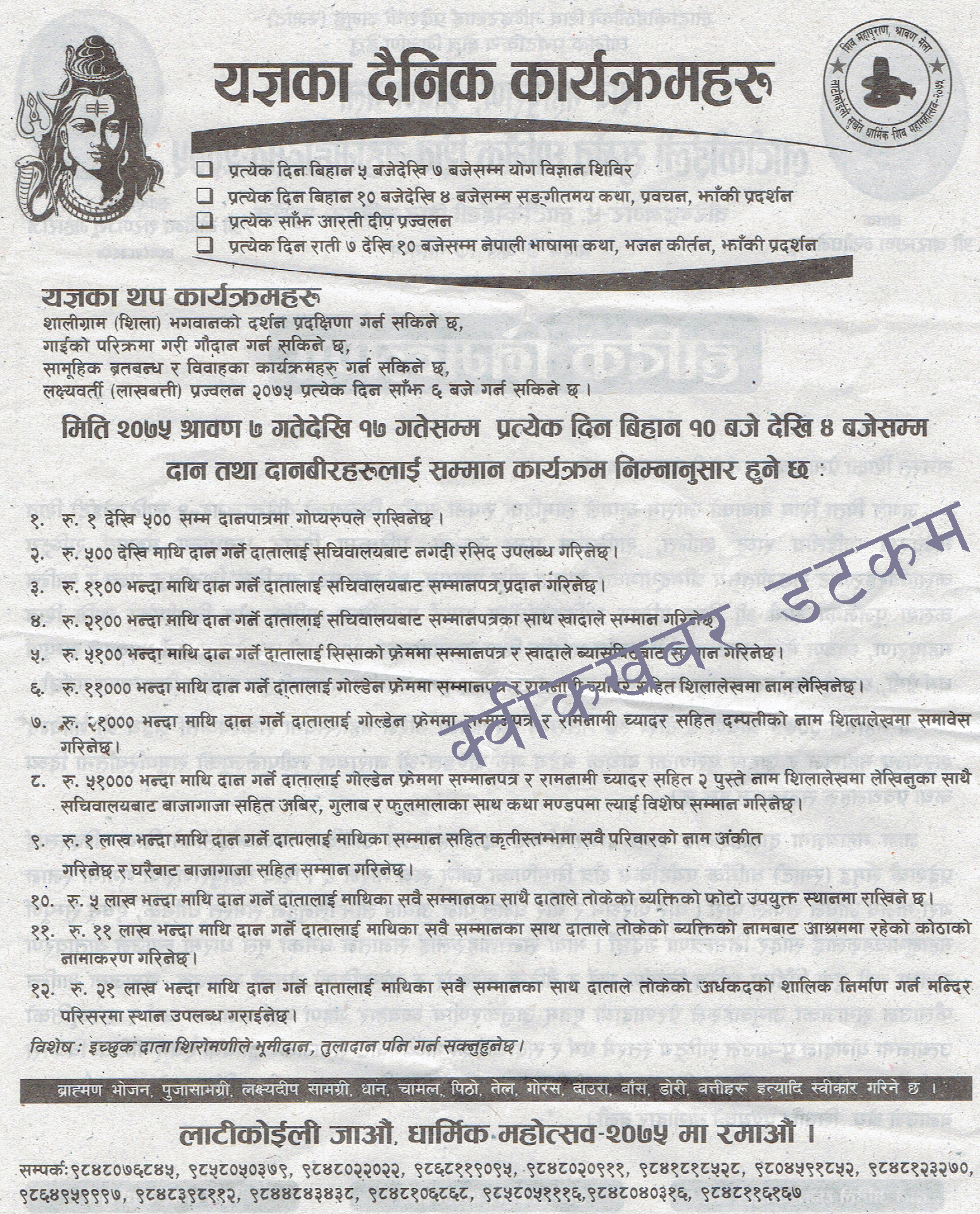 वीरेन्द्रनगरमा आयोजित पत्रकार सम्मेलनमा शिव महापुराण श्रावण महोत्सव बारे जानकारी दिने क्रममा अध्यक्ष श्रेष्ठले भन्नुभयो, ‘करिब १ करोड दान उठाउने लक्ष्य राखिएको छ भने ३ हजार स्फटिक शिवयन्त्र वितरण गर्ने लक्ष्य समेत राखिएको छ । उहाँले भन्नुभयो, विभिन्न व्यक्तिदेखि संघसंस्था र स्थानीय तहबाट समेत सहयोगको अपेक्षा गरेका छौ ।’