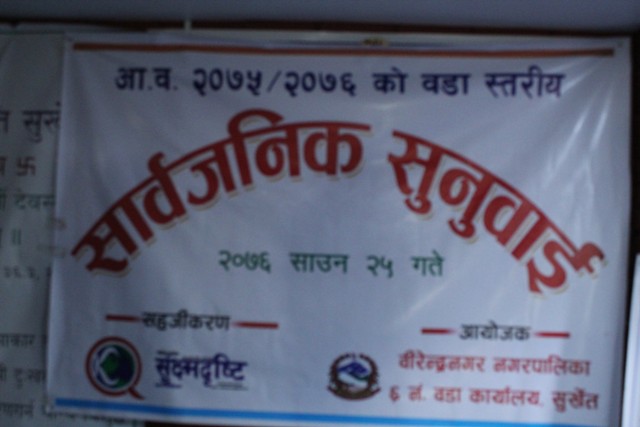 कर्णाली प्रदेशका राजधानी वीरेन्द्रनगर नगरपालिकाको वडा नं. ६ ले सार्वजनिक सुनुवाई कार्यक्रम सम्पन्न गरेको छ । उक्त कार्यक्रममा जन निर्वाचित प्रतिनिधिहरुले जनता समक्ष गरेको प्रतिवद्धताहरु क्रमिक रुपमा पूरा गर्दै आइरहेको बताएका छन् ।
