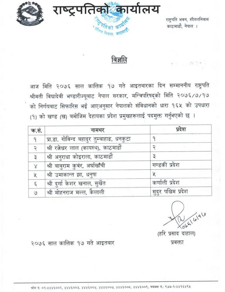 ‘आइतबार सम्माननीय राष्ट्रपति विद्यादेवी भण्डारीबाट नेपाल सरकार, मन्त्रिपरिषद्को मिति २०७६ ७ १७ को निर्णयबाट सिफारिस भइ आए अनुसार नेपालको संविधानको धारा १६५ को उपधारा (१) को खण्ड (ख) बमोजिम प्रदेश प्रमुखलाई पदमुक्त गर्नु भएको छ, राष्ट्रपति कार्यालयको विज्ञप्तिमा भनिएको छ ।