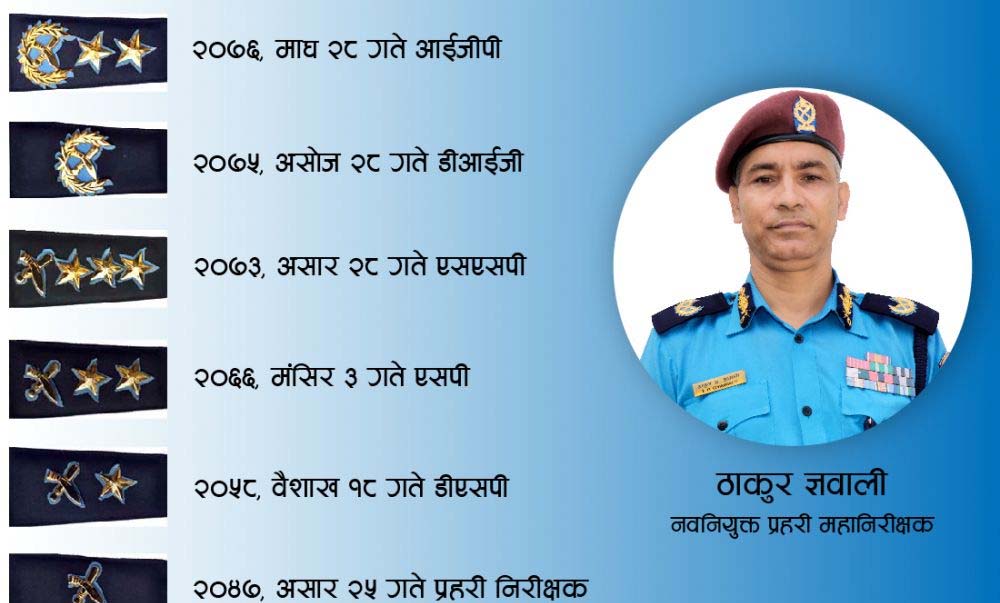 मंगलबार बसेको मन्त्रिपरिषद्को बैठकले ठाकुर ज्ञवालीलाई प्रहरी महानिरीक्षक आईजीपी मा नियुक्त गरेको छ । प्रदेश नम्बर १ को प्रहरी प्रमुखका रुपमा कार्यरत रहँदै आउनु भएका ज्ञवालीलाई सरकारले मंगलबार प्रहरी महानिरीक्षक नियुक्त गरेको हो ।
