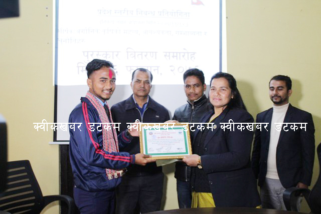 निबन्ध प्रतियोगीतामा प्रथम स्थान हासिल गर्न सफल जनज्योति नमुना माध्यमिक विद्यालय बराहताल ५ का खुमन शर्मालाई नगद २० हजार, द्वितीय स्थान हासिल गर्न सफल हिमालय माध्यमिक विद्यालय चौरजहारी ११ रुकुम पश्चिमका हिमाल वलीलाई नगद रु १५ हजार, तृतीय स्थान हासिल गर्न सफल श्री कृष्ण संस्कृत तथा साधारण माध्यमिक विद्यालय वीरेन्द्रनगर ७ सुर्खेतका लक्ष्मी ढकाललाई नगद रु १० हजार र सान्त्वना स्थान हासिल गर्न सफल जनज्योति नमुना माध्यमिक विद्यालय बराहताल ५ सुर्खेतका नविना कुमारी भण्डारी र शिव जन माध्यमिक विद्यालय श्रीनगर सल्यानका सिर्जना देवकोटालाई जनही नगद रु ७ हजार ५ सयका दरले पुरस्कार तथा प्रमाण वितरण गरिएको थियो ।