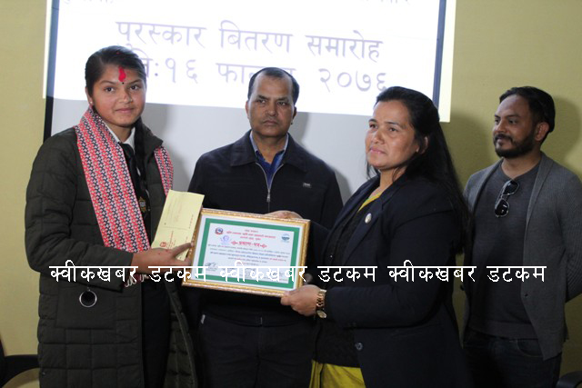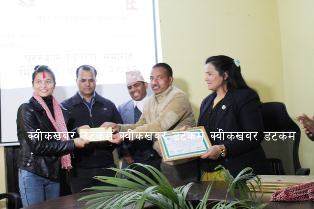 कर्णाली प्रदेशका भूमि व्यवस्था, कृषि तथा सहकारी मन्त्री विमला केसीले पुरस्कार वितरण गर्दै निबन्ध प्रतियोगीतामा सहभागी हुने सबैलाई धन्यवाद दिँदै स्थान प्राप्त गर्न सफल विद्यार्थीहरुलाई बधाई ज्ञापन गर्नुभएको थियो ।