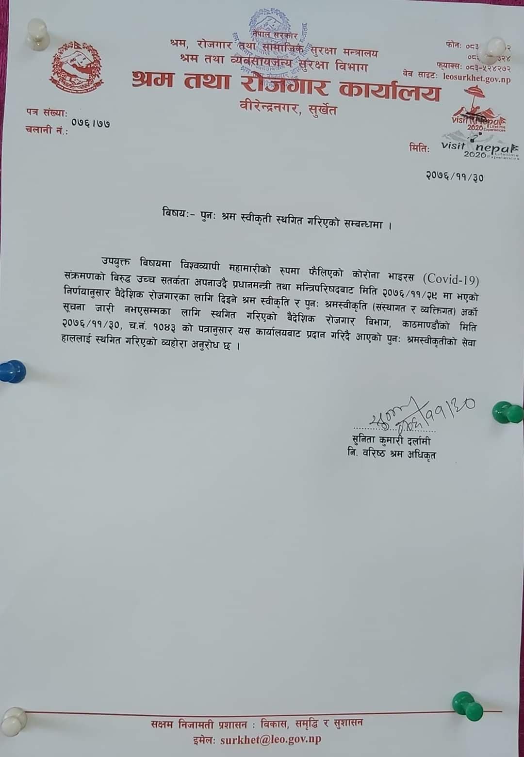 श्रम तथा रोजगार कार्यालय सुर्खेतकी निमित्त वरिष्ठ श्रम अधिकृत सुनिता कुमारी दर्लामीका अनुसार फागुन २८ गते कतारका र २९ गते कुवेतको लागि बन्द गरिएको थियो । शुक्रवार देखि देशभरीका श्रम तथा रोजगार स्वीकृत कार्यालयमा स्वीकृत बन्द गरिएको कार्यालयले जनाएको छ ।