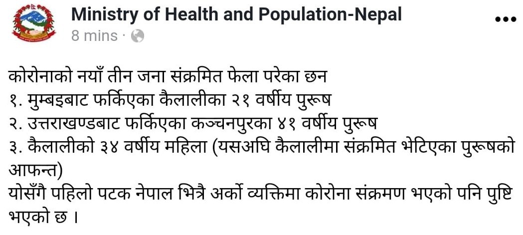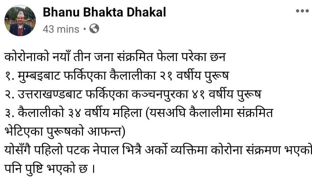 स्वास्थ्य मन्त्री भानुभक्त ढकालले पनि आफ्नो फेसबुक पेजमार्फत नेपालमा कोरोनाका थप तीनजना बिरामी भेटिएको उल्लेख गर्नुभएको छ ।