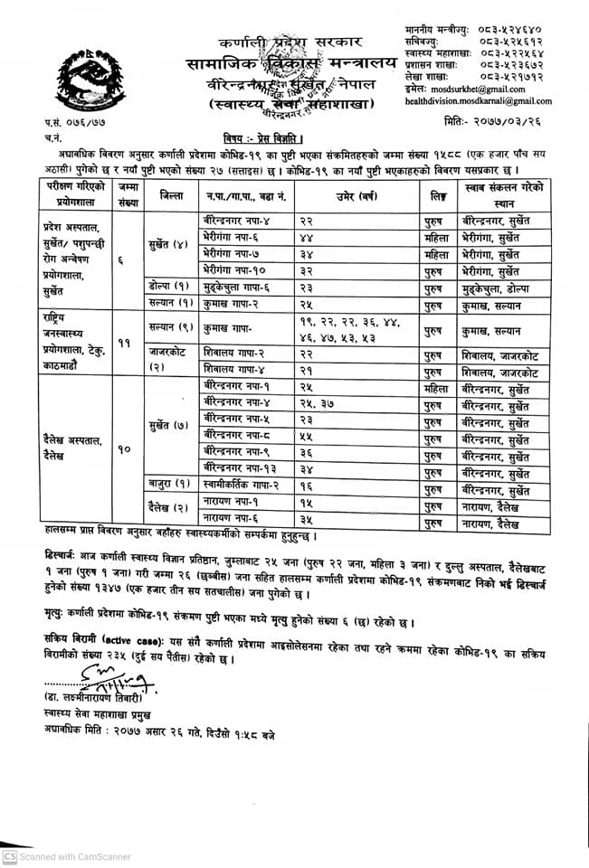 कर्णालीमा कोरोना संक्रमित थपिए २७, डिस्चार्ज भए २६