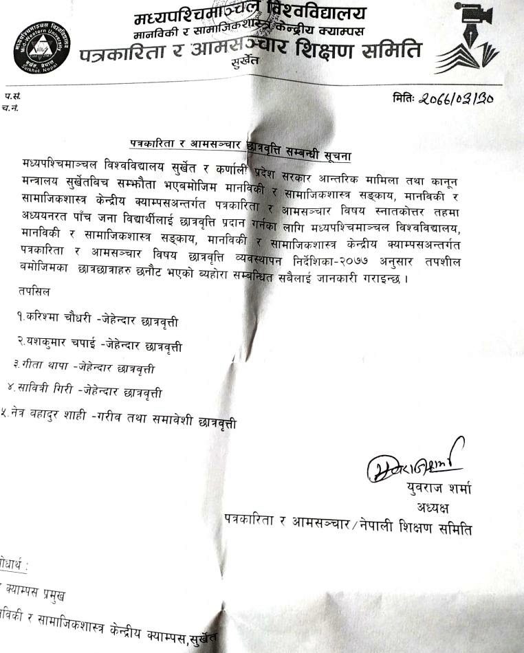 मध्यपश्चिमाञ्चल विश्वविद्यालय र कर्णाली प्रदेश सरकार आन्तरिक मामिला तथा कानून मन्त्रालयबीच भएको सम्झौतानुसार मानविकी र सामाजिकशास्त्र संकाय केन्द्रीय क्याम्पसअन्तर्गत पत्रकारिता र आमसञ्चार स्नातकोत्तर तहमा अध्ययनरत पाँच जना विद्यार्थीलाई छात्रवृत्ति प्रदान गरिएको हो ।