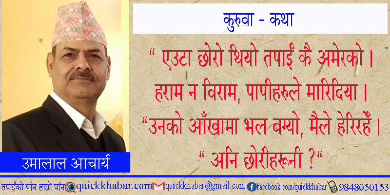 ” किलो भया दाम्लो हुन्याहो, किलै नभया दाम्लो क्या काम । बुहारी बाटो लागिगै । नुजा भुन्न पनि भयान ।” म प्रश्न माथि प्रश्न गरुँ यी दुखी आमाको आँसु खर्च भैरहन्छ । नगरुँ प्रश्न मेरो जिज्ञासा अधुरै रहन्छ । आफ्नो ईच्छा विपरीत तिनी आमालाई थप रुवाउने निधो गरेँ, उकुसमुकुस मेट्न ।