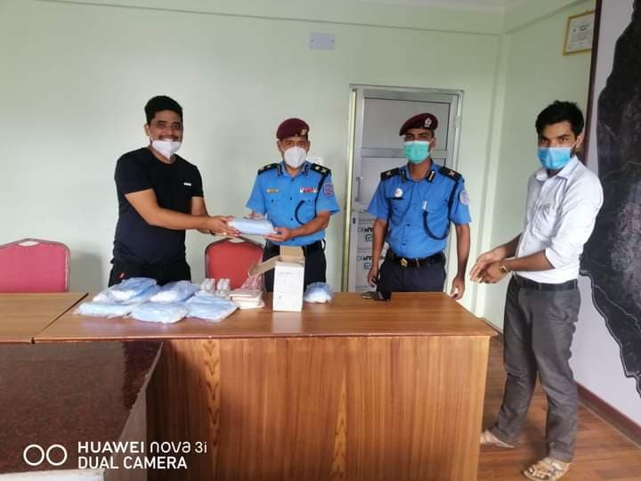 जिल्ला प्रहरी कार्यालय सुर्खेतबाट ड्यूटीमा खटिने प्रहरी कर्मचारीहरुका लागि मास्क वितरण गरिएको छ । वीरेन्द्रनगर ६ सुर्खेतमा रहेको सुर्खेत साइन्स एण्ड सर्जिकलका प्रोपराइटर श्याम विष्टले ५०० थान मास्क, ३० थान सर्जिकल पञ्जा र १२ थान सेनिटाइजर प्रहरीलाई आइतबार प्रदान गरेका हुन् ।