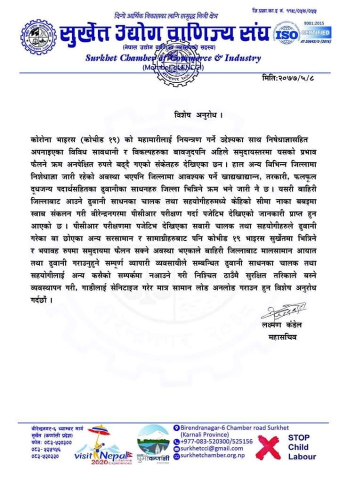 कोरोना भाइरसको महामारीलाई नियन्त्रण गर्ने उद्देश्यका साथ निषेधाज्ञासहित विविध सावधानी र विकल्पहरुका बावजुद पनि समुदायस्तरमा यसको फैलिने क्रम अनपेक्षित रुपमा बढ्दै गएकोले सुरक्षित रहनका लागि सुर्खेत उद्योग वाणिज्य संघले सबैलाई अनुरोध गरेको छ ।