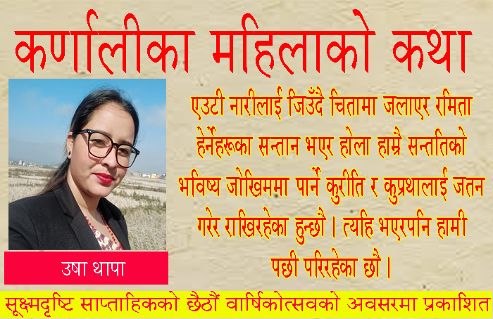 नेपालमा महिला माथि अन्याय परापूर्व कालदेखी नै हुँदै आएको छ । तर कुसस्कारलाई सबैले मान्दै आएको पाईन्छ । हाम्रो धर्म, संस्कृति, रितीरिवाज, सामाजिक विधि र व्यवहारमा पनि महिलालाई पछाडी नै पारेको देखिन्छ । कर्णालीका विकट गाउँका महिलाहरू उमेरले २५ देखी ३० वर्षका भएपनि ५० वर्ष कटेको जस्तो देखिन्छन् । किनकी उनीहरूको सानै उमेरमा विवाह, भोक, रोग, गरिबीको पीडा र कामको बोझ पनि हो, कलिलै उमेरमा बुढौली देखिनुको अर्को कारण ।