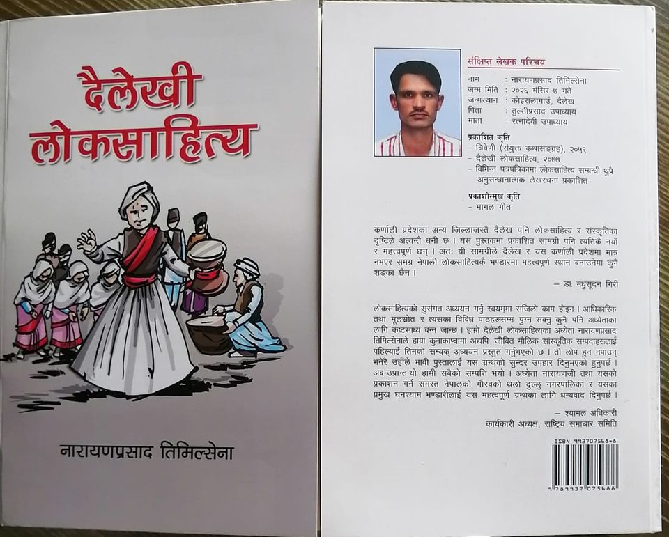 दैलेखी लोकसाहित्य नामक पुस्तक बजारमा आएको छ । लोकसाहित्यका क्षेत्रमा कलम चलाउँदै आएका लोकसाहित्य संरक्षणका अभियान्ता नारायणप्रसाद तिमिल्सेनाले दैलेख लोकसाहित्य बजारमा ल्याएका हुन् । दुल्लु नगरपालिका प्रकाशक रहेको दैलेखी लोकसाहित्य नामक पुस्तक दुई खण्डमा विभाजित छ । पहिलो खण्डमा लोकसाहित्यको सिद्धान्तलाई विश्लेषण गरिएको छ भने दोस्रो खण्डमा दैलेखी लोकसाहित्य रहेको छ ।