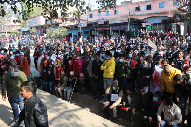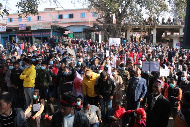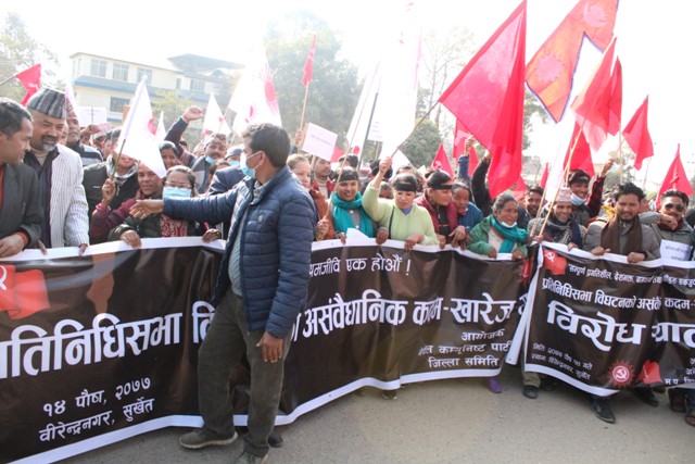 वीरेन्द्रनगरको मंगलगढी चौकबाट सुरु भएको विरोध ¥याली बजार परिक्रमा गर्दै पिपल चौतारामा पुगेर सभामा परिणत भएको छ । सभामा नेकपा प्रचण्ड–माधव समूहकी नेतृ रामकुमारी झाँक्री लगायत, झकबहादुर मल्ल, अमृत बिसी, नरबहादुर विष्टले सभालाई सम्बोधन गरेका थिए ।