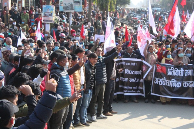 प्रर्दशनमा सहभागीहरुले ‘संसद विघटन खारेज गर’, ‘तानाशाह केपी ओली मुर्दावाद’, ‘ओली तेरो पाराले दुःख पाए साराले जस्ता नारा लगाउँदै विरोध प्रदर्शन गरेका थिए ।