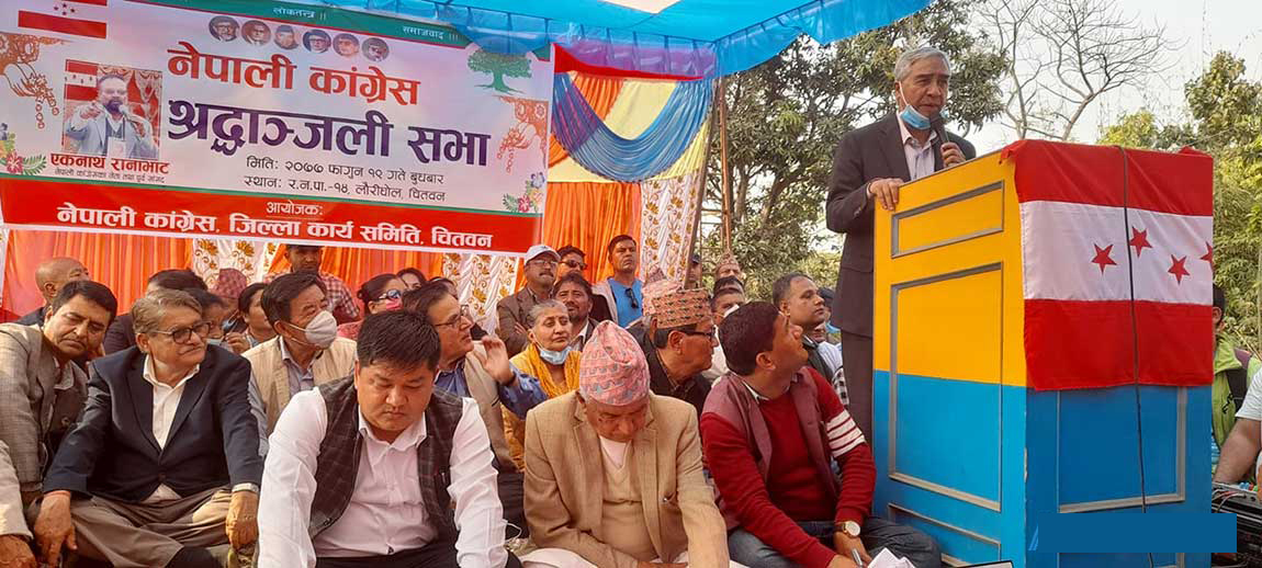 उनले राजनीतिक भाषा बोल्न चितवन नआएको तर पौडेलले बोलेपछि बोल्नुपरेको बताए।  ‘राजनीतिक कुरा केही भन्नु छैन।  रामचन्द्रजी बोलिहाल्नुभयो के गर्ने समस्या परिहाल्यो’, उनले पूर्वसांसद एकनाथ रानाभाटको श्रद्धाञ्जली सभामा भने, ‘कांग्रेस पदउन्मुख पनि छैन, काँधमा आएको जिम्मेवारीबाट भाग्नेवाला पनि छैन।  प्रधानमन्त्री पाउँ पनि भनेको छैन है रामचन्द्रजी।  परि आयो भने भाग्नेवाला पनि छैन।  त्यसकारण पार्टीलाई फाइदै होला।  राम्रो कुरा त्यही हो। ’