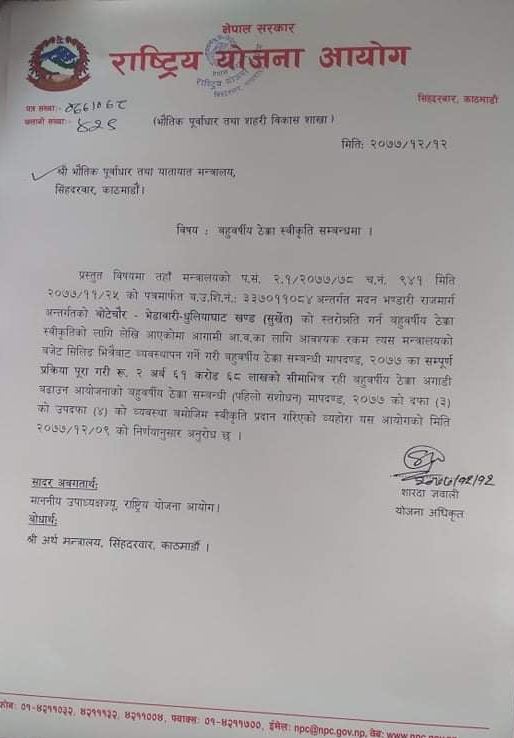 उक्त ठेक्काका लागि राष्ट्रिय योजना आयोगको भौतिक पूर्वाधार तथा शहरी विकास शाखाले समेत स्वीकृति दिइसकेको छ । भौतिक पूर्वाधार तथा यातायात मन्त्रालय योजना शाखाका अनुसार ३ अर्ब १ करोड बजेट विनियोजन भएको मदन भण्डारी राजमार्गको शान्तिनगर मेचीडाँगी चोक, धरान–केराबारी–लेटाङ्ग–मधुमल्ला र बोटेचौर–भेडाबारी–धुलियाविट गरी ३ वटा सडक खण्डहरुमा ८ अरब २ करोड ९१ लाख बराबरको बहुबर्षिय ठेक्का व्यवस्थापन गर्ने सहमति भएको थियो ।