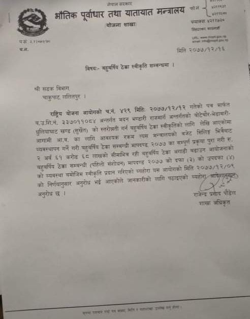 आगामी आ.व. का लागि आवश्यक रकम सिलिङ्ग भित्रैबाट व्यवस्थापन गर्ने गरि बहुबर्षिय ठेक्का सम्बन्धि मापदण्ड २०७७ का सम्पूर्ण प्रक्रिया पूरा गरी २ अर्व ६१ करोड ६८ लाखको सीमाभित्र रही बहुबर्षिय ठेक्का अगाडि बढाउन भौतिक पूर्वाधार तथा यातायात मन्त्रालयको योजना शाखाले जानकारी दिएको हो ।
