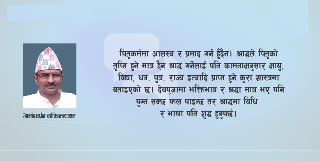 जस्तैः दीन–हीन व्यक्तिले पनि सागैले मात्र भए पनि श्राद्ध गर्नैपर्छ, छोड्न हुँदैन भन्ने शास्त्रीय निर्देश छ। त्यसैले होला नेपाली समाजमा “देउताले दिन्छन् पितृले हर्छन्” भन्ने उक्ति चलेको देखिन्छ। अतः पितृकर्ममा आलस्य र प्रमाद गर्न हुँदैन। श्राद्धले पितृको तृप्ति हुने मात्र हैन श्राद्ध गर्नेलाई पनि कामनाअनुसार आयु, विद्या, धन, पुत्त्र, राज्य इत्यादि प्राप्त हुने कुरा शास्त्रमा बताइएको छ। देवपूजामा भक्तिभाव र श्रद्धा मात्र भए पनि पुग्न सक्छ फल पाइन्छ तर श्राद्धमा विधि र भाषा पनि शुद्ध हुनुपर्छ। त्यसैले भनिन्छ— “पितरो वाक्यमिच्छन्ति भावमिच्छन्ति देवताः”।
